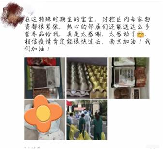 常梦豫利用自己的专业优势,与团队一起组织参与了许多抗疫活动。她通过本地同事的调研与需求分析,从禄口孕妈群体作为切入点,通过建立微信群聊“禄口孕妈互助群”了解孕妈第一需求,为禄口孕妈群体解决困难。此外,她还成立了志愿者群招募居民志愿者协助社区工作、为禄口街道宠物救助连接资源、开展疫情主题的线上公益课堂……