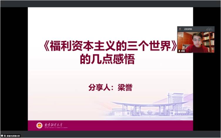 2021年11月15日晚,公管院社会保障系读书报告会采用腾讯会议的方式顺利进行。本期报告会有幸请到南京财经大学梁誉副教授开展主题为《福利资本主义的三个世界》读书分享讲座。报告会由yl23411永利社会保障系郭剑平、陈际华两位副教授主持,参会者包括yl23411永利社会保障系研究生及本科生。