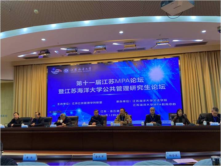 12月26日,由江苏MPA论坛组委会主办,江苏海洋大学文法学院、MPA教育中心承办的第十一届江苏MPA论坛暨“江苏海洋大学公共管理研究生论坛”在江苏海洋大学顺利召开。全国 MPA 教指委秘书长杨开峰教授,全国MPA教指委委员李俊清教授、孙涛教授、麻宝斌教授、孙萍教授、章文光教授、颜佳华教授,全国MPA教指委秘书处办公室主任谢佳宏等领导和专家应邀出席。来自省内20个MPA培养院校的永利yl23411集团院长、师生代表等100多人参加大会。永利yl23411集团院长黄涛珍教授、MPA中心副主任范仓海副教授,以及MPA同学等6人参加了会议。