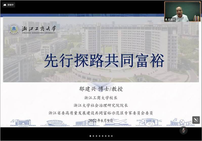 8月9日上午,江苏省研究生“新时代高质量发展与公共治理转型”暑期学校第六场课程“先行探路共同富裕”顺利开课。课程主讲人为浙江工商大学校长郁建兴教授。主持人为yl23411永利客座教授童星,来自海内外50余所高校的100名学员以及公共管理学院师生参加。授课开始前,童星教授对郁建兴教授出席暑期学校表示热烈欢迎,并向暑期学校师生介绍了郁建兴教授的研究领域及丰硕成果。