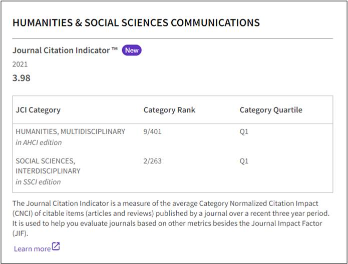 Humanities & Social Sciences Communications(HSSC)是Nature旗下唯一面向人文社会科学的刊物,被SSCI和A&CHI共同索引,具有重要影响力。HSSC期刊引用指数(Journal Citation Indicator)为3.98,在人文等多学科领域的400余种期刊中排名第9,在社会科学等多学科领域的263种期刊中排名第2.此项科研成果有助于提高我校社会科学学科在国内外的学术影响力。