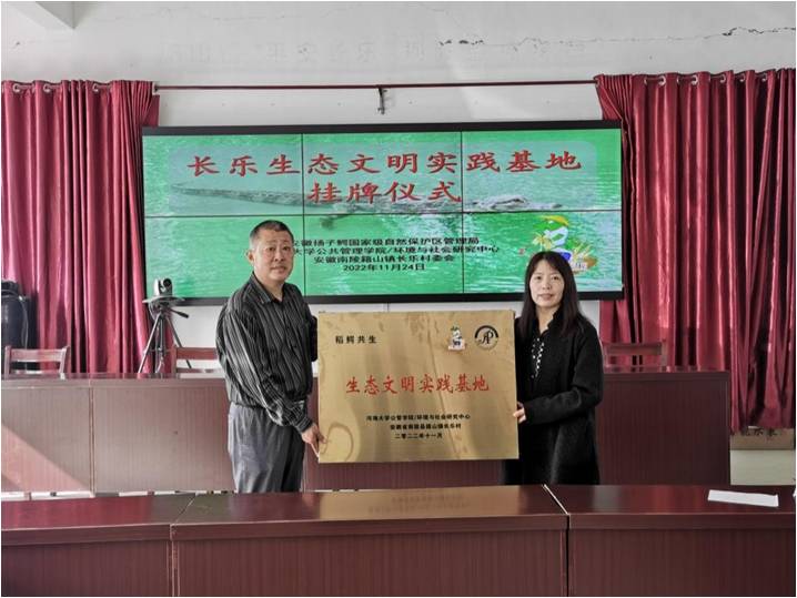 为进一步深化校地合作,助力乡村振兴,推进生态文明建设,2022年11月24日上午,“长乐生态文明实践基地”挂牌仪式在安徽省南陵县籍山镇长乐村顺利举行。永利yl23411集团党委副书记朱志梅教授、副院长陈涛教授、社会学系主任顾金土教授出席了挂牌仪式,芜湖市委政法委三级调研员、籍山镇长乐村党委第一书记、驻村工作队队长邢毅,安徽扬子鳄国家级自然保护区管理局南陵保护站站长涂根军等班子成员参加仪式。南陵县乡村振兴局党组成员、副局长管健应邀出席挂牌仪式。