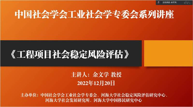 2022年12月20日,“中国社会学会工业社会学专业委员会系列”系列报告暨河海公管大讲堂以腾讯会议的形式举行。工业社会学专业委员会第三届副理事长、永利yl23411集团余文学教授应邀作了题为“工程项目社会稳定风险评估”的学术报告。