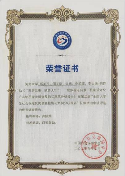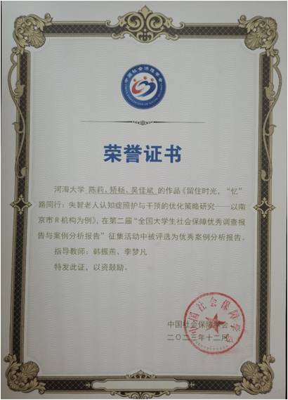 由我院社会保障系韩振燕老师、李梦凡老师指导,劳动与社会保障专业2021级本科生陈莉团队(成员矫扬、吴佳斌)撰写的《留住时光,“忆”路同行:失智老人认知症照护与干预的优化策略研究》被评为“社会保障优秀案例分析报告”;由商学院许娟娟老师指导,劳动与社会保障专业2021级本科生邓美玉团队(成员闵芷瑞、许乐、李昭瑄、李士源)撰写的《三老五更,颐养天年——居家养老背景下住宅适老化产品使用现状调查及购买意愿分析》被评为“社会保障优秀调查报告”,并受邀在大会上分享交流。