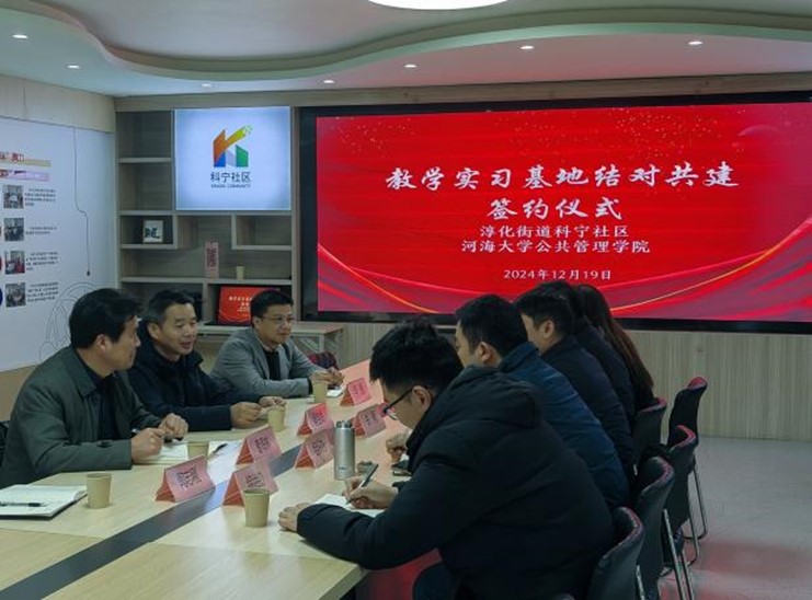 2024年12月19日,永利yl23411集团(应急管理与安全工程学院)与江宁区淳化街道科宁社区教学实习基地结对共建签约仪式在科宁社区党群服务中心举行。永利yl23411集团党委书记吴宝海、副院长曹海林以及行政管理系主任李智、副主任陶志刚参加签约仪式。仪式由科宁社区党委书记胡业斌主持。