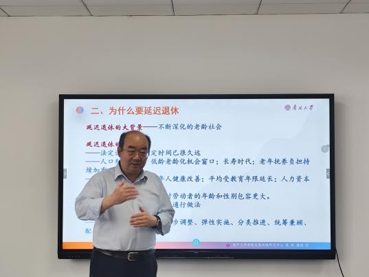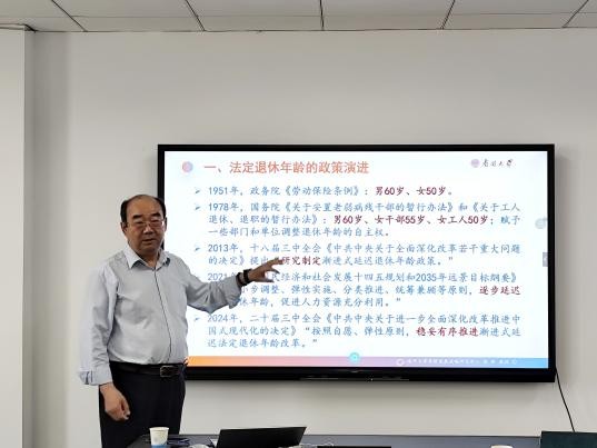 2025年4月19日下午,河海社会学论坛第二百二十六期于厚学楼909会议室如期举行。南开大学老龄发展战略研究中心主任、中国老龄协会/南开大学老龄社会治理战略研究中心主任、中国人口学会副会长原新教授受邀为我院师生做题为“渐进式延迟退休,为什么?怎么做?”的学术报告。报告会由我院人口研究所黄健元老师主持,陈际华老师、郭剑平老师以及众多博/硕士生参加了报告会。