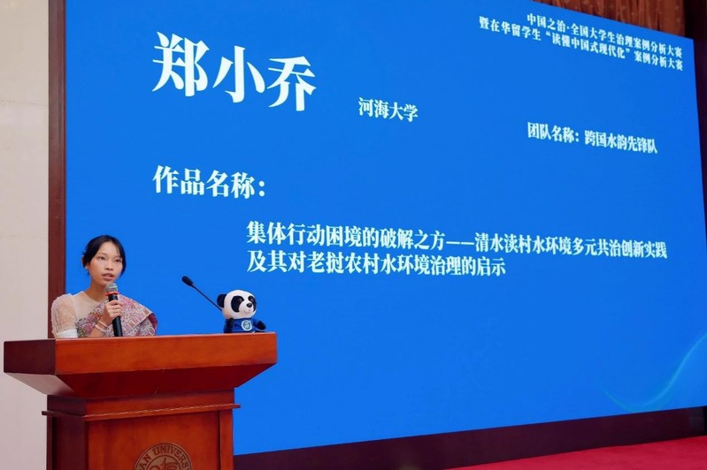 “中国之治”全国治理案例分析大赛以学术思想为媒、以实践调研为基,以治理方案为要,为中外大学生搭建了读懂和促进中国实现国家治理体系与治理能力现代化的项目展示平台,鼓励在实践的沃土中培育人才、发展能力,激励大学生深入剖析实际案例,提出创新性治理思路。我校跨国水韵先锋队选择以常州金坛校区附近的金坛区清水渎村的水环境“多元共治”模式为研究对象,运用协同治理、多中心治理理论,通过实地走访、访谈等方式深入调研,总结出一套可复制、可推广的治理经验。值得一提的是,该作品特别阐述了“多元共治”模式对老挝农村水环境治理的启示。老挝作为内陆国家,水资源丰富但分布不均,水污染问题严重,农村地区在水环境治理上面临资金不足、管理效率低下、基层实施困难等挑战。而清水渎村 的经验为老挝提供了新思路:在治理主体上,强调政府、市场和居民多元参与,整合各方力量,提升治理能力;在治理方式上,通过党建引领,动员村民参与并实现创收,提高治理热情;在技术应用上,借鉴“三水合一”的生态改造方法,实现污水净化和资源循环利用。
