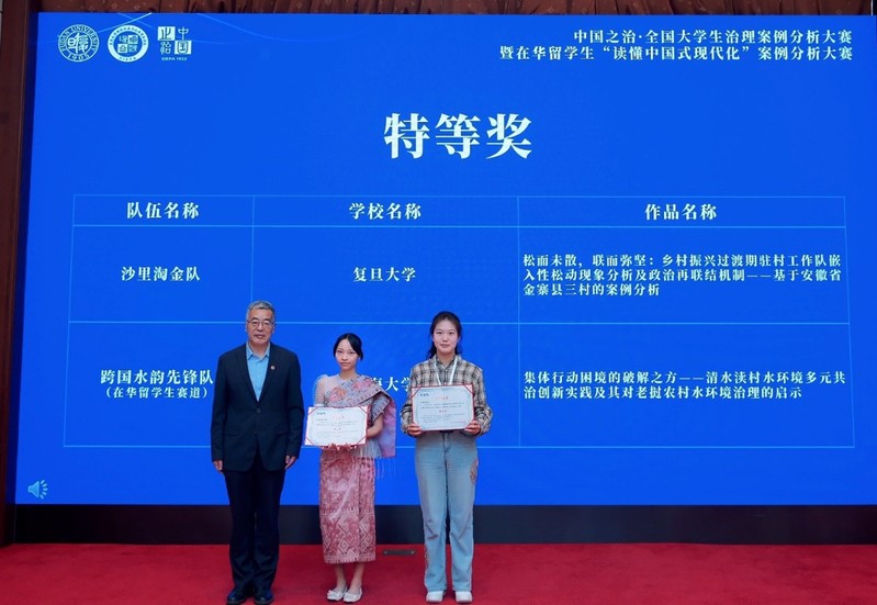 2025年4月19日至20日,复旦大学国际关系与公共事务学院举办的中国之治·全国大学生治理案例分析大赛暨在华留学生“读懂中国式现代化”案例分析大赛决赛在复旦大学邯郸校区顺利举行并圆满落幕。本次比赛共有全国130余所高校的380余支队伍参赛。永利yl23411集团2022级社会学本科生郑小乔(留学生,老挝)牵头的“跨国水韵先锋队”提交的案例作品《集体行动困境的破解之方:清水渎村水环境“多元共治”创新实践及其对老挝农村水环境治理的启示》(指导老师:公管院张虎彪副教授、金坛区清水渎村第一书记耿欣、公管院陈涛教授;团队成员:郑小乔、杨雨菲、于婧芳、王愫金、纳提)斩获特等奖。复旦大学国务学院院长苏长和教授给团队颁奖。
